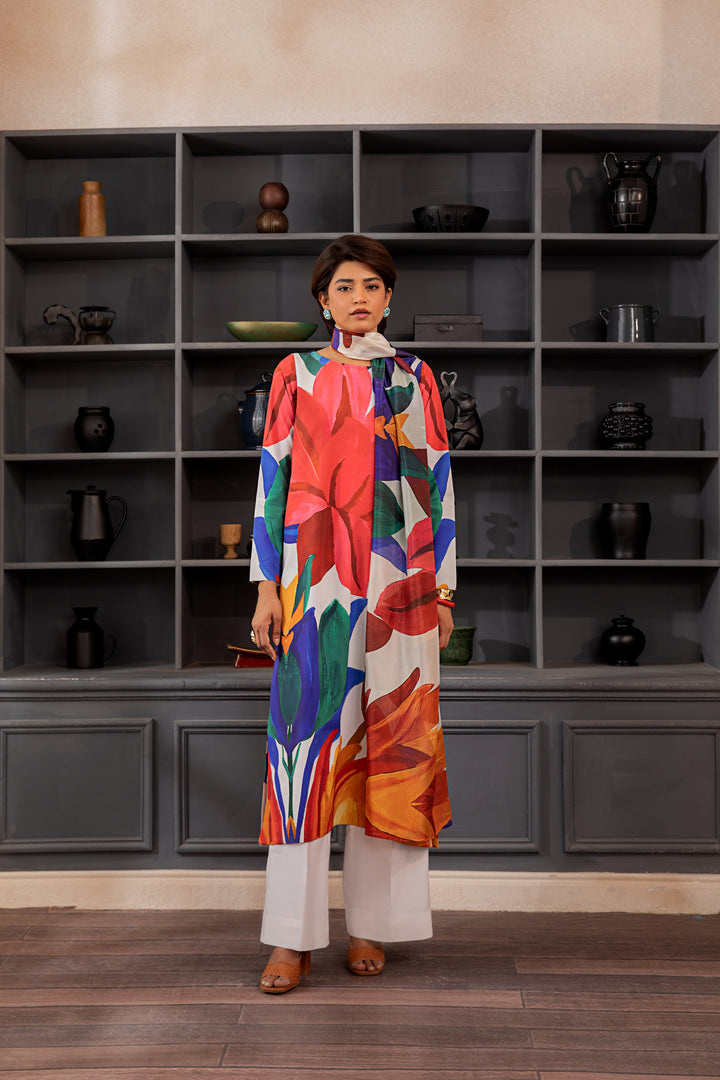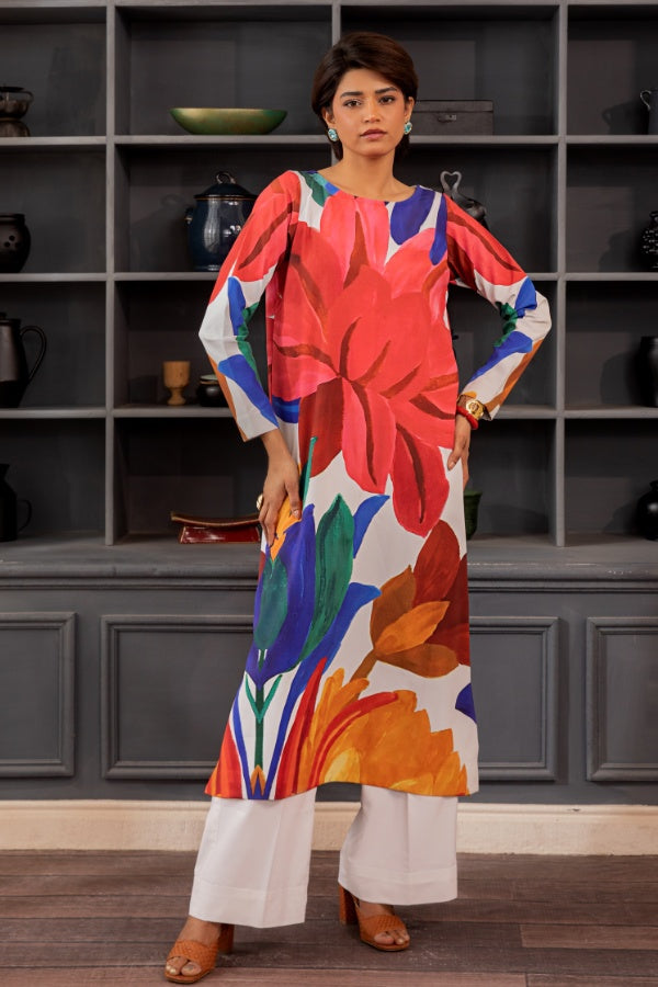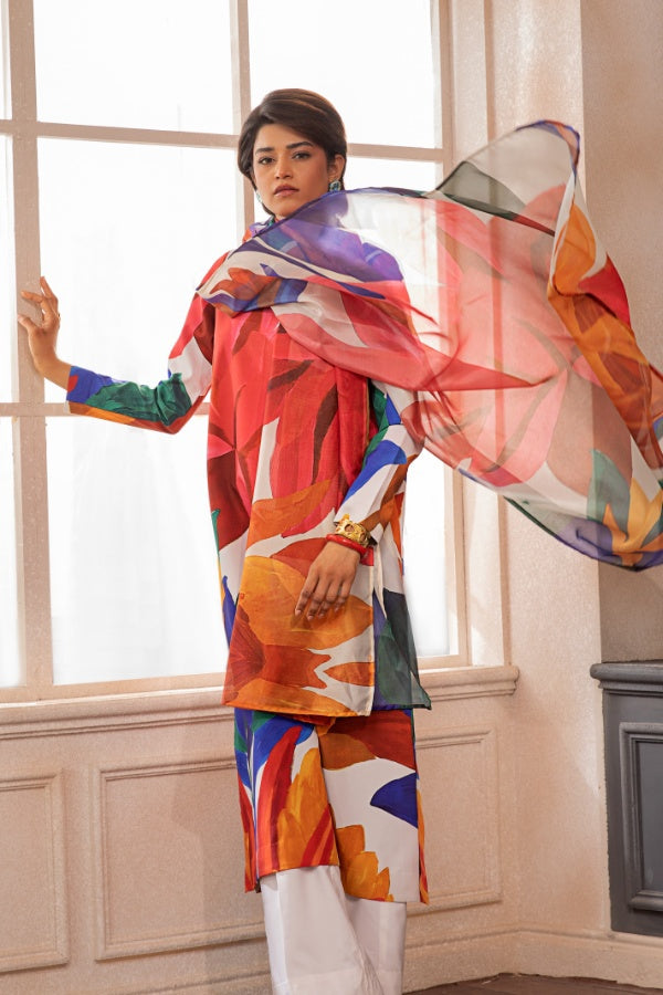 | Make a statement with the Dahlia Set, a vibrant fusion of color and elegance. Featuring a bold floral print in striking pinks, blues, and rust hues, this ensemble exudes a playful yet sophisticated charm. Crafted from premium crepe fabric, the top’s eye-catching design is perfectly balanced by the solid flared trousers, adding effortless grace and movement. Ideal for both casual outings and special occasions, this set is a wardrobe essential for those who love to stand out. Style it with minimal accessories and sleek footwear for a polished yet bold look. |