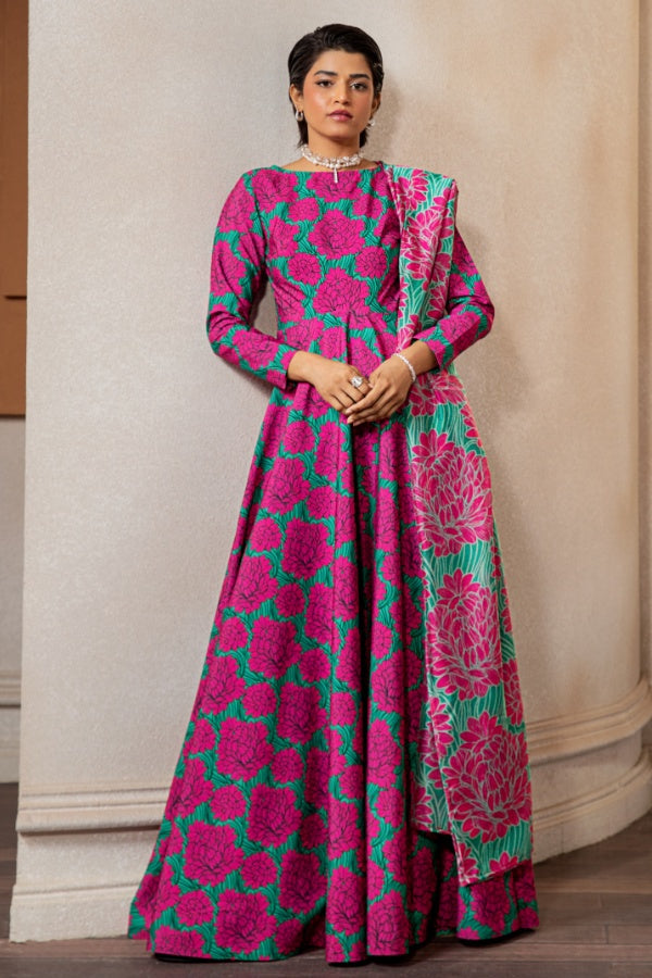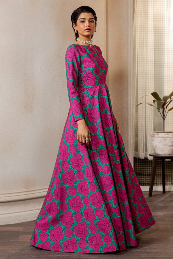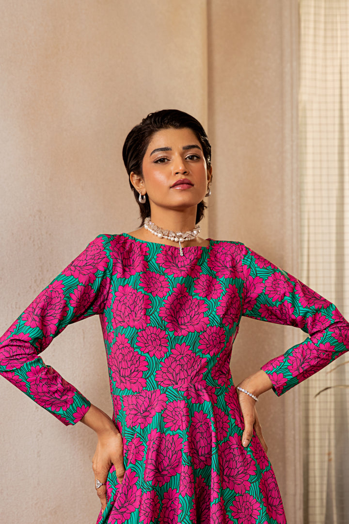 | Fiona Dress is a dreamy fusion of vibrant hues and graceful movement. Crafted from premium crepe fabric, this flared silhouette embodies romance with its bold floral print in striking shocking pink, beautifully contrasted against lush green base accents. The flowing structure adds effortless charm, making it a standout piece for any occasion. Paired with solid green straight trousers, this set exudes understated sophistication. Style it with Strappy nude heels, delicate pearl studs for an elegant feel, or a statement cuff bracelet to enhance the bold color palette |